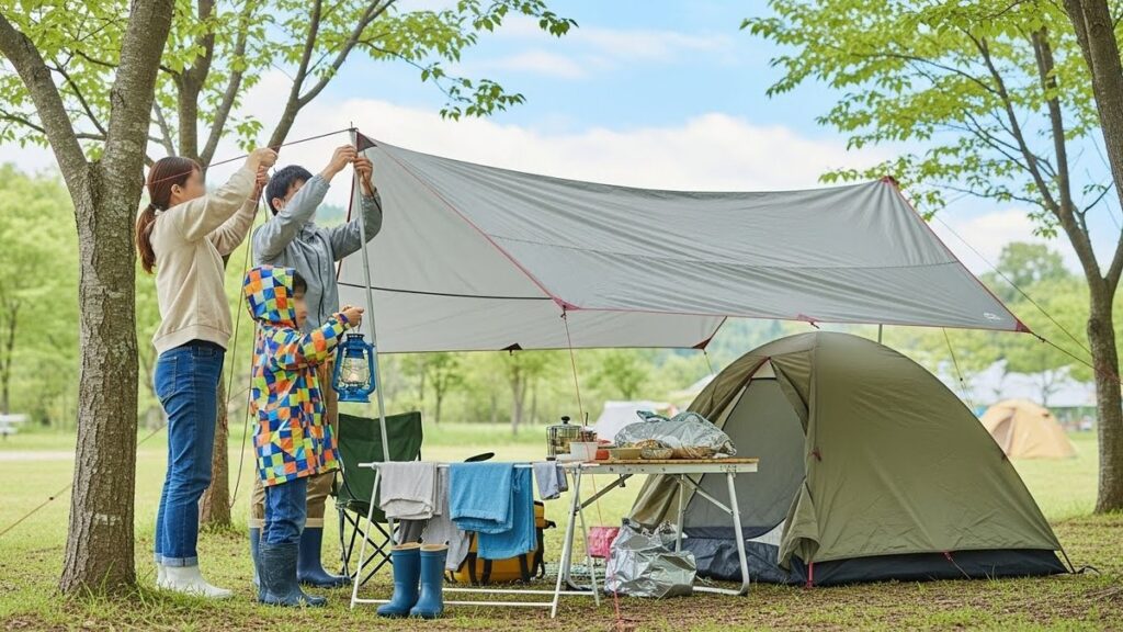 子連れでも安心して楽しむ雨キャンプのコツ|到着後の屋根作りと濡れ物対策で快適に