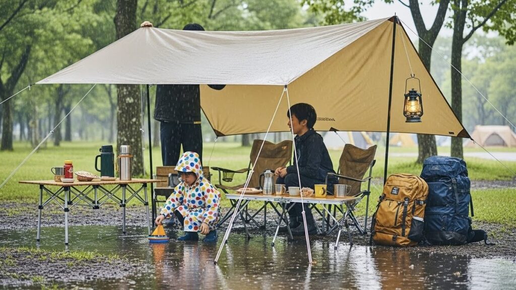 雨の日キャンプで子供と楽しく安全に過ごすコツ|屋根作りから遊び・撤収まで