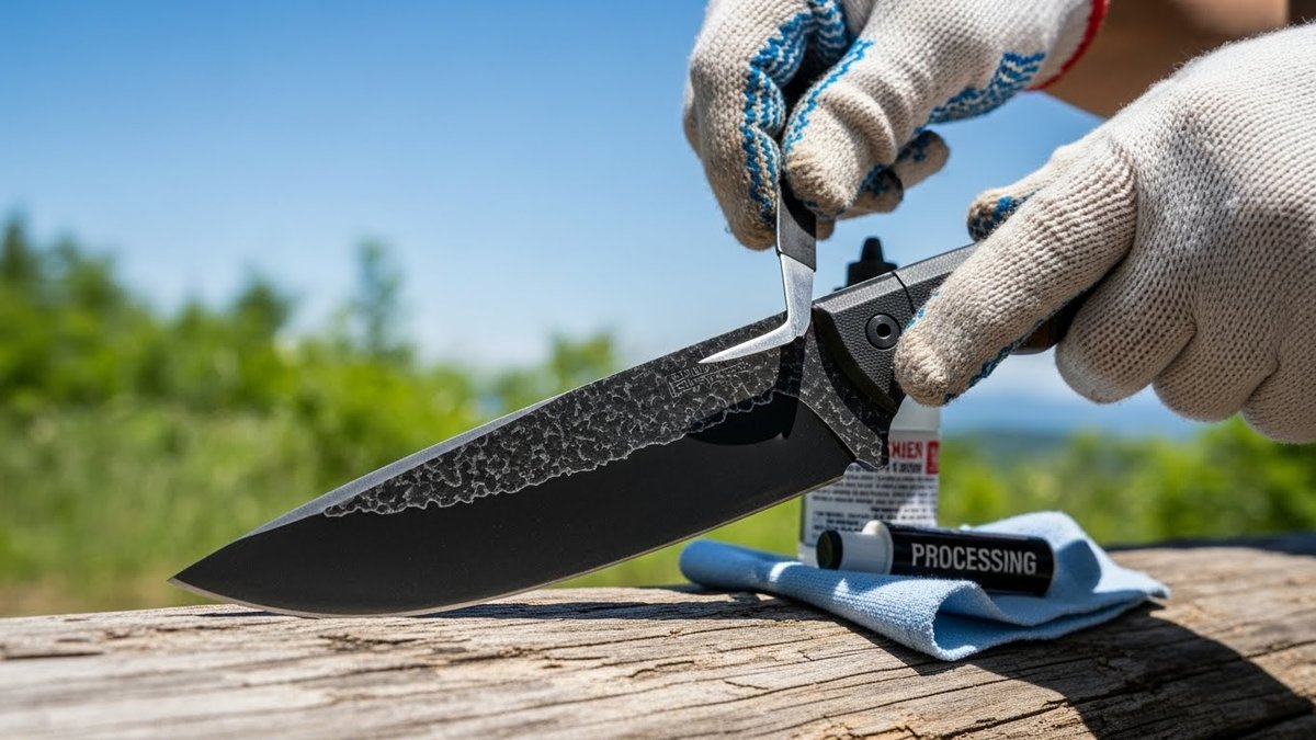 黒錆加工の成否の9割は、この「下地作り」にかかっていると言っても過言ではありません。まずはナイフの表面についている古い油や汚れを完全に落としましょう。中性洗剤で洗った後、パーツクリーナーを吹きかけ、キッチンペーパーで水分と油分を徹底的に拭き取ります。この時、素手で刃を触ると指紋の油がついてしまうため、必ずゴム手袋を着用して作業を行ってください。