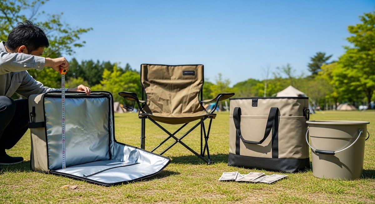 アウトドアチェアの収納袋を自作、あるいは新調する際に最も重要かつ基本となるのが、チェアを折りたたんだ状態の「正確なサイズ」を把握することです。多くの人が陥りやすい失敗が、メーカー公称の収納サイズだけで判断してしまうことです。