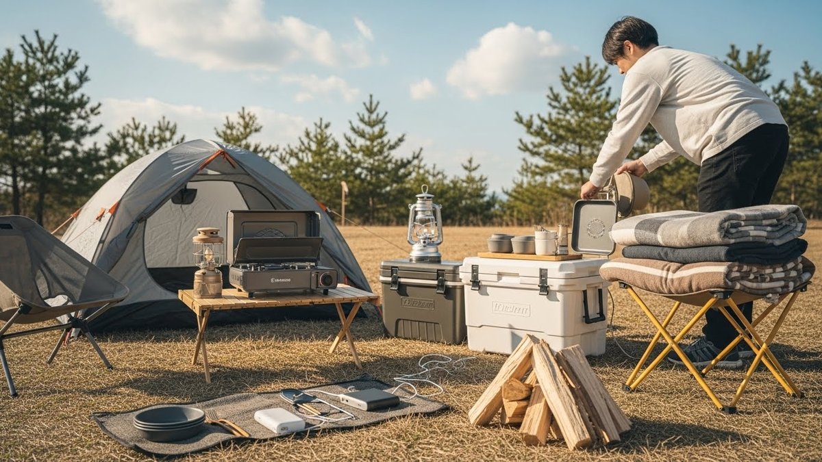 春秋は朝晩の冷え込みに備えつつ、日中は過ごしやすい季節です。薄手のダウンやフリースを用意して、温度に応じて着脱するスタイルがおすすめです。照明は暖色系のLEDランタンで落ち着いた雰囲気を演出します。