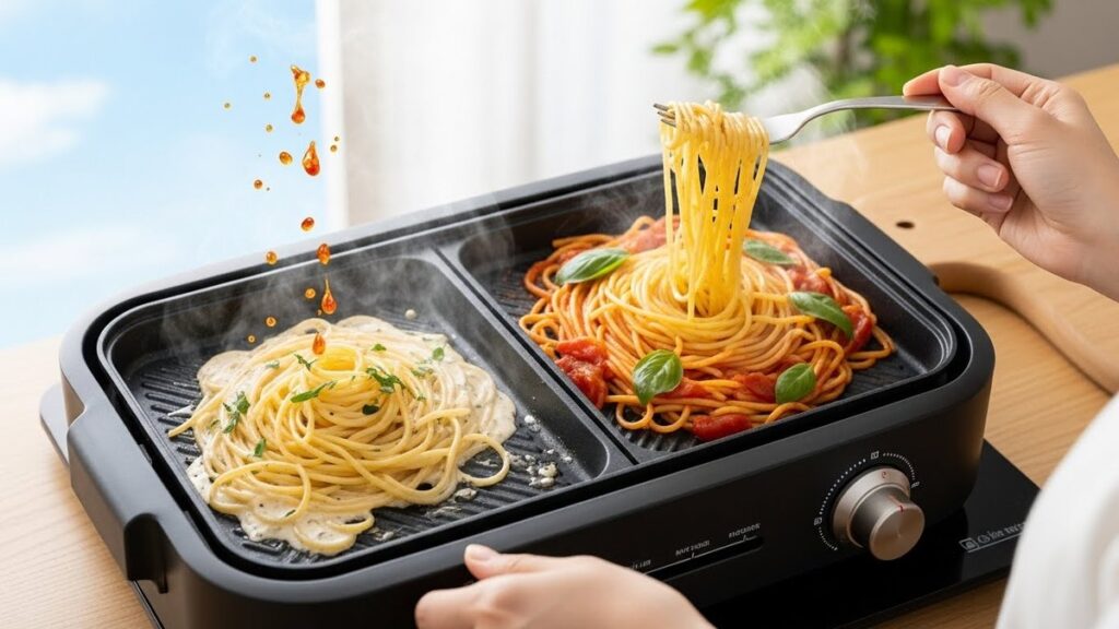 マルチグリドルで手早く旨く作るパスタ術!火加減と水分で差が出る