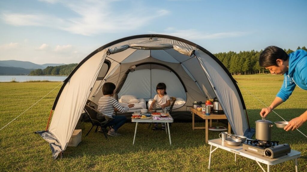 カマボコテント3のレイアウトで家族が快適に過ごすための配置や動線を紹介します。リビングと寝室の分け方や出入口からの導線、暖房やタープとのつなぎ方まで具体例を掲載。サイズ別・季節別の配置やギア配置チェックリストで設営がぐっと楽になります -