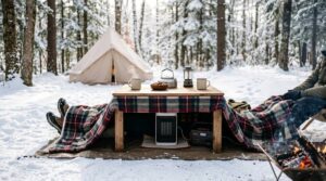 一方、冬場は「遮風」と「保温」が重要になります。メッシュテントだけでは冷気が入り込んでしまうため、DDタープを地面にぴったりつけるように低く張る(クローズスタイル)必要があります。この際、内部のテントが結露で濡れないよう、タープとの距離感を適切に保つ工夫が求められます。季節に応じた張替えができるのがDDタープの強みです。
