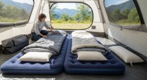 また、寝室部分の広さだけでなく、天井の高さも重要なポイントです。天井が高いテントであれば、腰を屈めることなく着替えができ、長時間の滞在でも圧迫感を感じません。特に雨の日や寒い時期はテント内で過ごす時間が長くなるため、広さは心の余裕に繋がります。さらに、前室と呼ばれるリビングスペースが広いタイプであれば、別途タープを用意しなくても雨よけや日よけとしての機能を果たしてくれます。道具一式を検討する際は、寝室とリビングが一体となった「2ルームテント」も視野に入れると、居住空間の確保が一段と楽になります。家族全員がストレスなく横になれるスペースがあるか、図面や寸法表をしっかりチェックして、ゆとりある空間を選びましょう。
