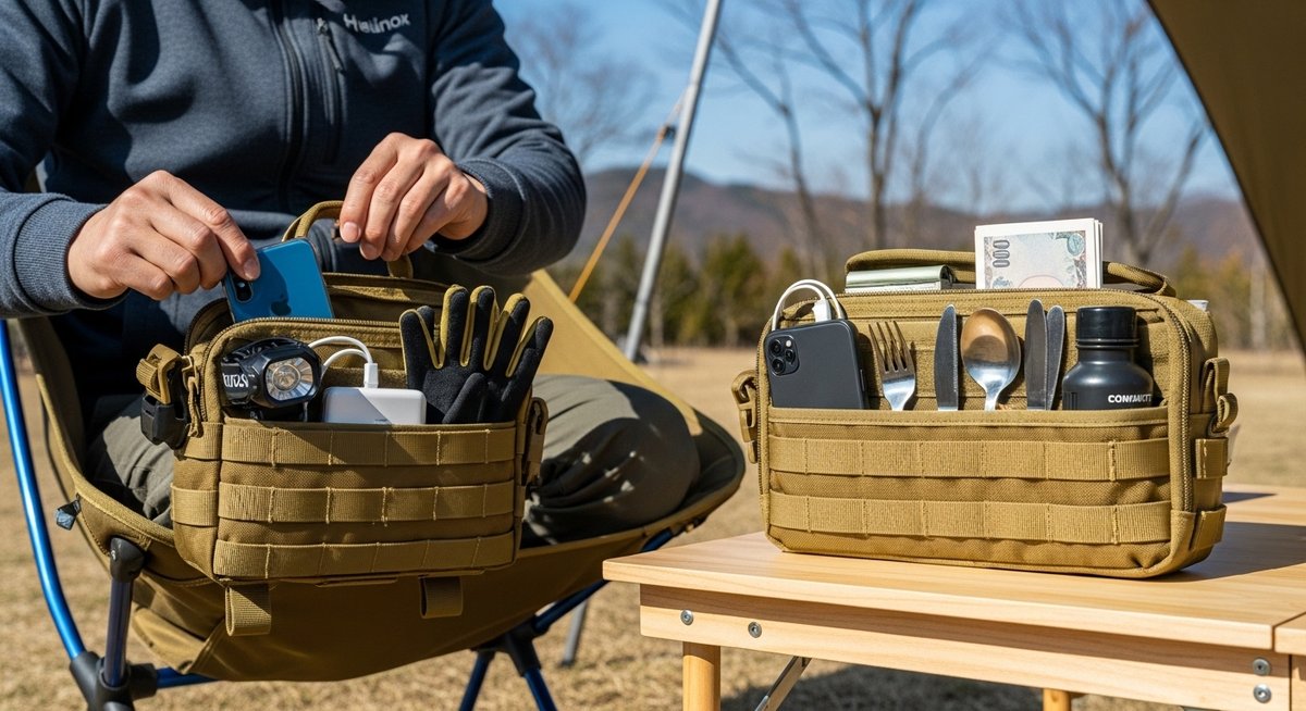 また、装着する側のギア(チェアやテーブル)との相性も、安定性に直結します。例えば、タクティカルテーブルのサイドにMサイズのストレージを装着する場合、中身の重さが2kgを超えるとテーブル自体が傾く可能性があります。このような場合、ストレージ側に「底面を支える仕組み」や、別の箇所からも固定できる補助ストラップがあるかをチェックすべきです。安定性は安全な使用に直結する重要な要素です。