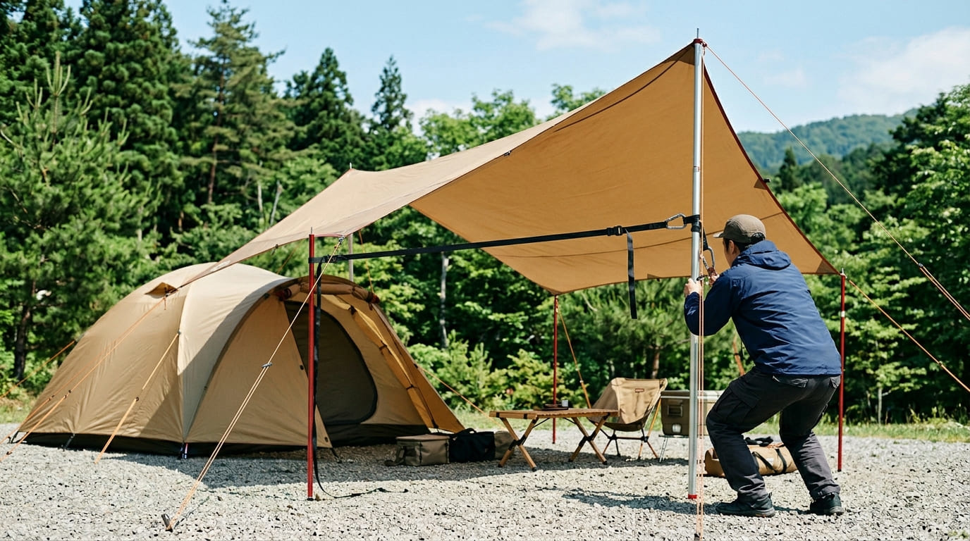 一方、ハトメ式はあらかじめ決まった位置で固定するため、強風時でも長さがズレにくいというメリットがあります。ご自身の設営スタイルを想像し、テントをすっぽり覆いたいのか、少しだけ重ねたいのかを基準に、必要な最大長と調整のしやすさを天秤にかけて選んでみてください。