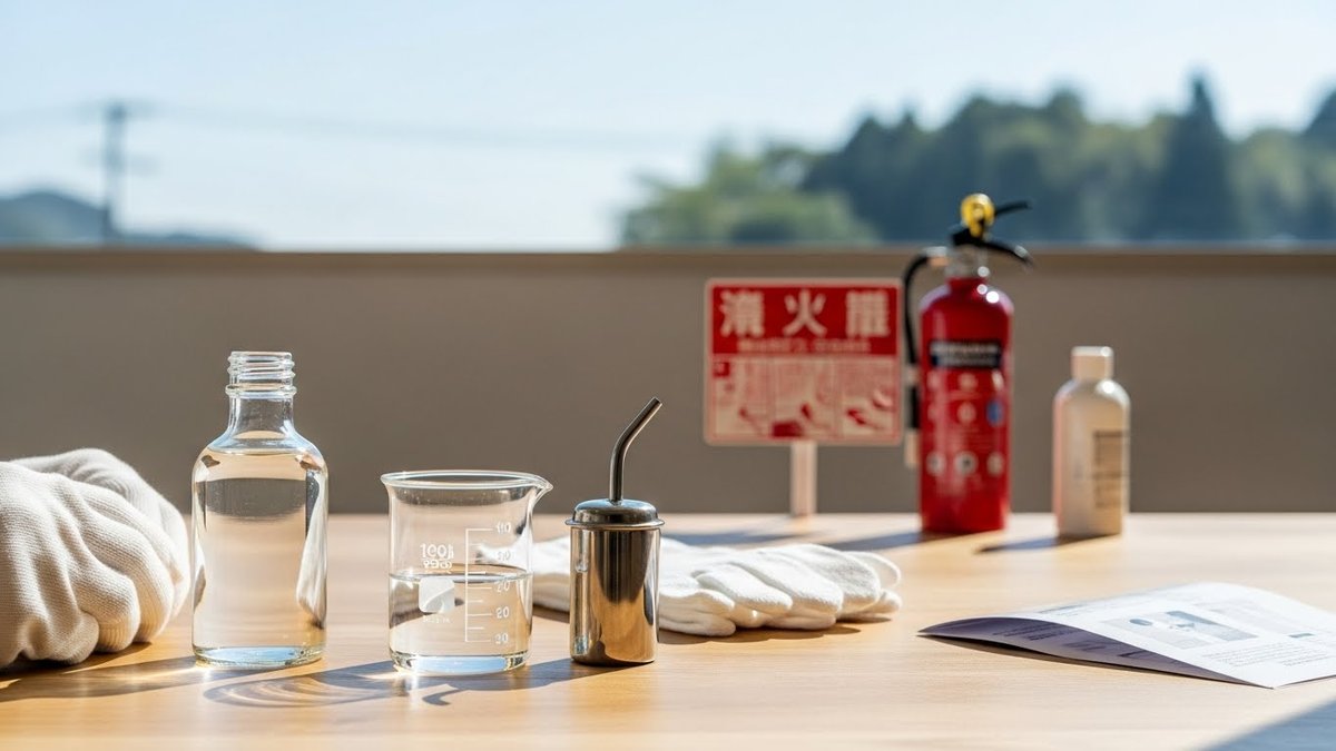 調合や移し替え時は少量ずつ行い、床にこぼした場合は速やかに拭き取り、可燃性の布は廃棄してください。火気からは十分に距離を取り、使用中も目を離さないことが基本です。