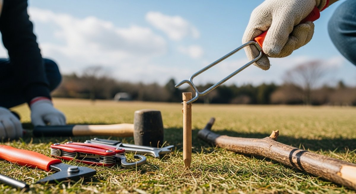 簡易ペグ抜きは短時間で作れるため現場で重宝します。必要なのは金属の棒や太めの針金、持ち手用の布やテープです。棒の先端を曲げてフック状にし、持ち手にテープや布を巻いて滑り止めを作れば完成です。