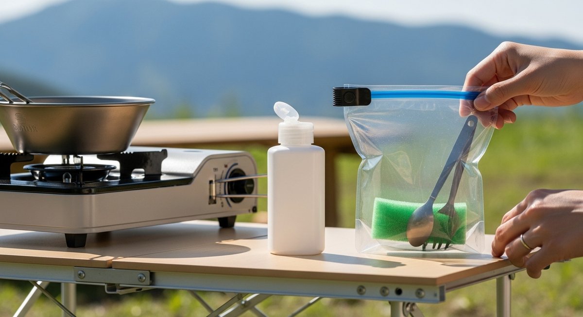 荷物を減らすためには、持っていく洗剤の量、容器の形状、スポンジのサイズを見直すと効果的です。洗い物を最小限にする調理法や、紙皿や使い捨てカトラリーの活用も検討できます。快適さと環境配慮のバランスを意識して用意しましょう。
