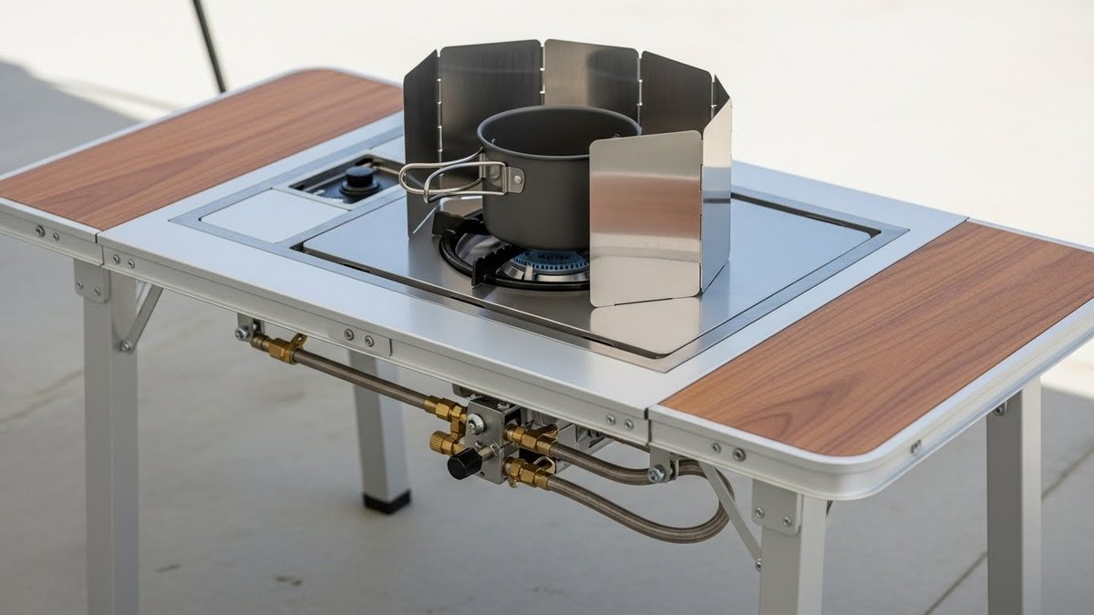 キャンプでよく使われる一般的な折りたたみテーブルや、天板が繋がっている一体型のテーブルには、フラットバーナーをそのまま組み込むことはできません。無理に載せようとするとバーナーが安定せず、調理中に滑り落ちたり、火が天板に近すぎて焦がしてしまったりする危険性があります。