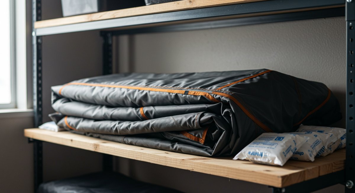 本体は四隅、中央、収納袋内に分散して配置します。ポールやペグなどの金属部品は別の小袋に乾燥剤を入れて一緒に保管すると錆防止になります。
