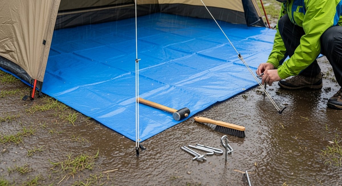 テントの雨対策としてブルーシートを敷く際、最も致命的なミスは、シートの端がテントからはみ出してしまうことです。もしシートがテントより外に出ていると、テントの屋根から滴り落ちた雨水がシートに溜まり、そのままテントの底面(フロア)とシートの間に流れ込んでしまいます。これでは、わざわざシートを敷いたことが逆効果になり、テントの中が浸水する原因となります。