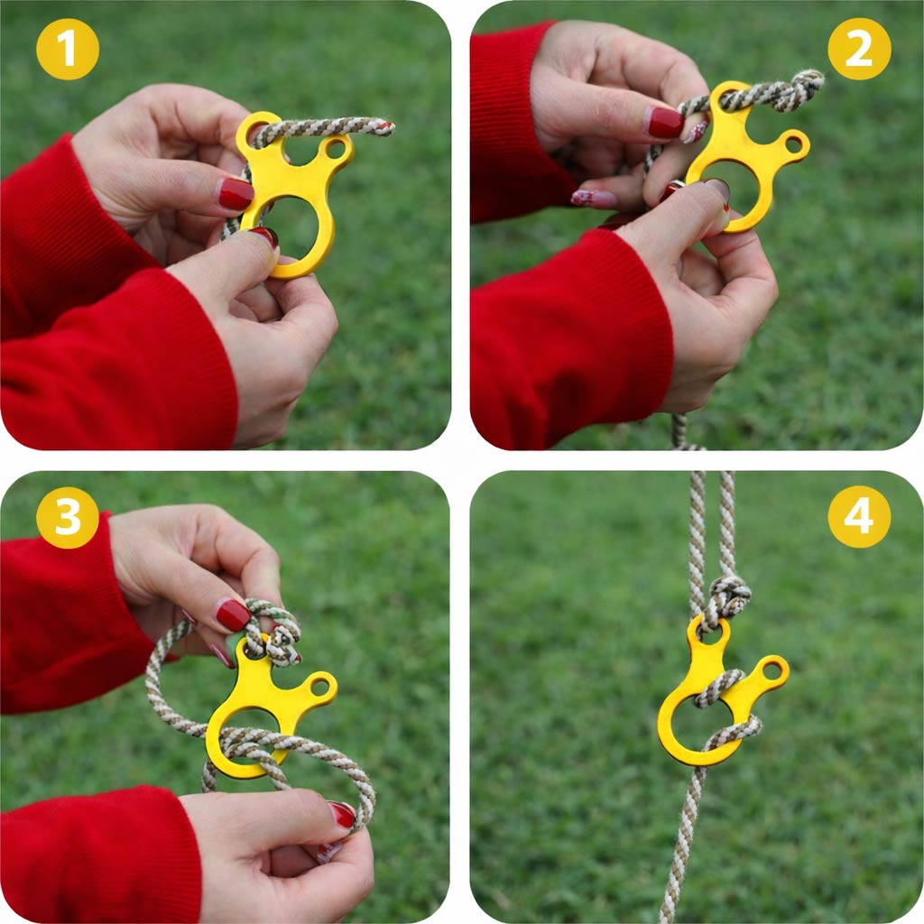 通し方の例としては、まずロープ先端を中央の穴に通してから片側の穴へ回し、もう一度中央に戻す方法が安定します。テンションをかける前に軽く引いて摩擦点を作ると滑りにくくなります。