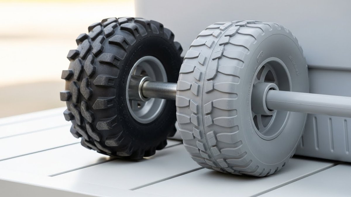 タイヤの素材と形状をよく見てください。プラスチック製の硬いタイヤは、舗装されたアスファルトの上では軽快ですが、砂利道ではガタガタと振動が大きく、音も響きます。また、砂地では空回りしやすいという弱点があります。