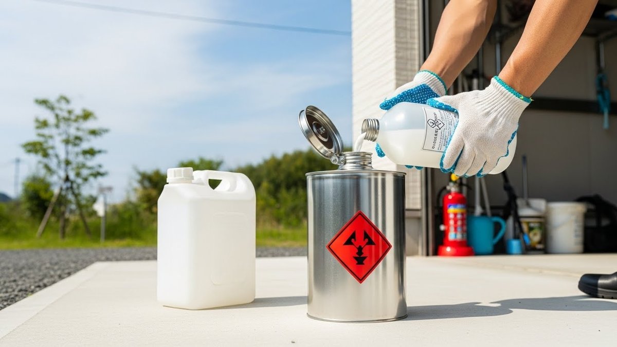 ガソリンタンクや金属容器に移し替えて保管する際も、適切な容器でない場合は漏れや破損の原因になります。古い容器の再利用は避け、専用容器がない場合は業者に依頼して安全に処理してください。周囲に燃えやすいものがある場所での作業もやめてください。