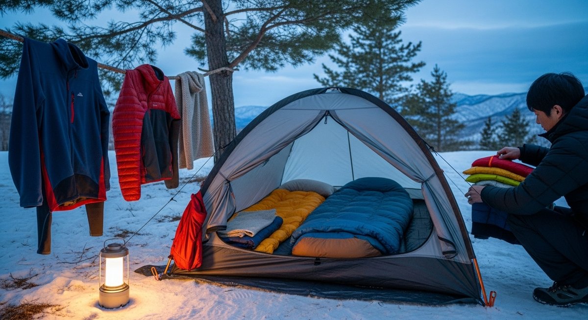服は層で考え、ベースレイヤー、ミドル、アウターを揃えます。寝るときには乾いたフリースやダウンジャケットを追加して体温を保持してください。帽子やネックゲイター、手袋、厚手の靴下も用意し、就寝時には特に足元と頭部を冷やさないことを心がけてください。