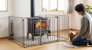 薪ストーブを安全に使い続けるための最重要ルールは、「可燃物との離隔距離」を厳守することです。煙突は燃焼中、想像を超える熱を放射します。壁の中に隠れている柱や断熱材が、その熱でじわじわと炭化し、ある日突然発火する「低温着火」は非常に恐ろしい現象です。